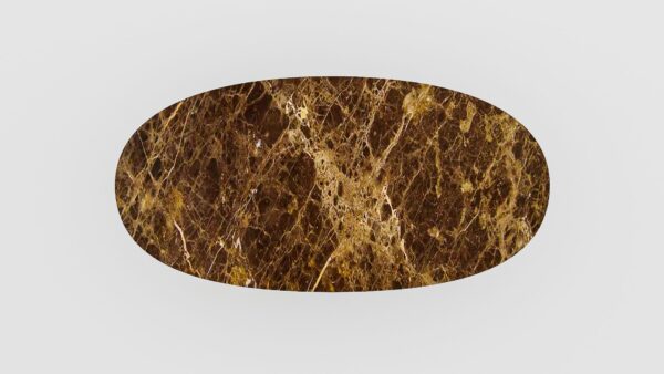 De verschillende bruintinten, van donker tot lichtbruin en soms zelfs richting caramel, maken deze bruine ovaal marmeren tafel tot een waar kunstwerk. Het is een marmersoort die we veel terugzien en dat komt omdat deze bruine ovale marmeren tafel uitstekend te combineren is met aardse elementen als hout, planten en kleuren als zand en beige. Een zeer elegante marmersoort met een zachte en uitdagende ‘tekening’.