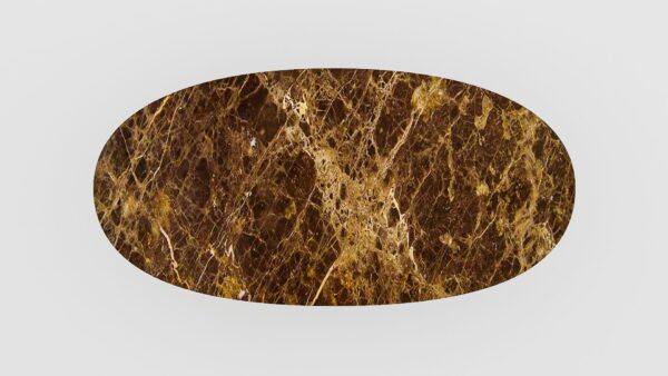 De verschillende bruintinten, van donker tot lichtbruin en soms zelfs richting caramel, maken deze bruine ovaal marmeren tafel tot een waar kunstwerk. Het is een marmersoort die we veel terugzien en dat komt omdat deze bruine ovale marmeren tafel uitstekend te combineren is met aardse elementen als hout, planten en kleuren als zand en beige. Een zeer elegante marmersoort met een zachte en uitdagende ‘tekening’.