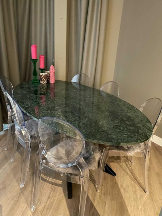 Kenmerkend voor deze groene ronde marmeren eettafel zijn de verschillende groentinten in dit Ver Green marmer. Hierdoor is het een prachtplaatje in je eetkamer en uitstekend te combineren met jouw eigen woonstijl. Ronde marmeren tafels zijn de leukste en meeste gezellige tafels om aan te dineren, omdat je met iedereen goed kan kletsen. Wij weten er alles van, want we houden enorm van lang tafelen ;)